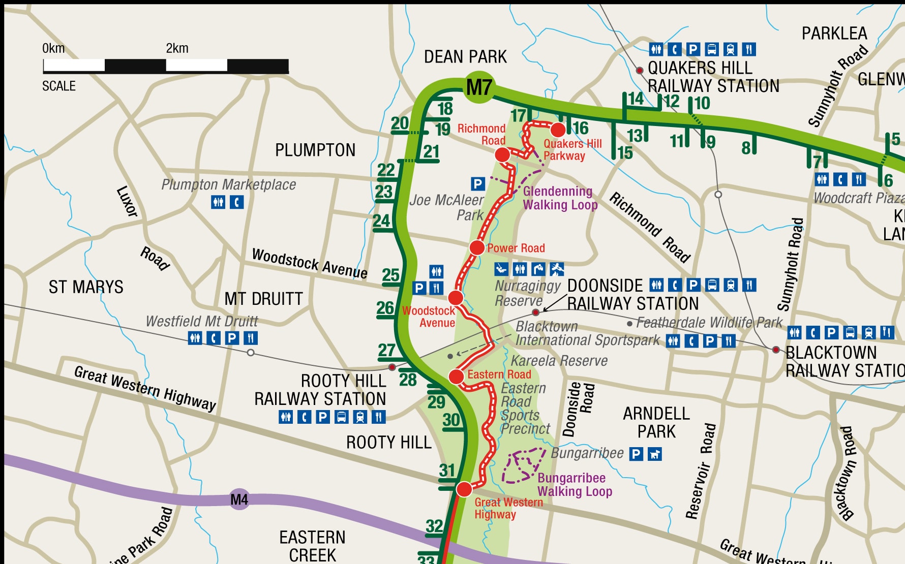 For older riders you can make a loop out of it by going southwest along the M7 path from the northern end. Exit the M7 onto Eastern rd at The Rooty Hill and roll down the wide footpath Blacktown sports centre to rejoin the path into Nurragingy.